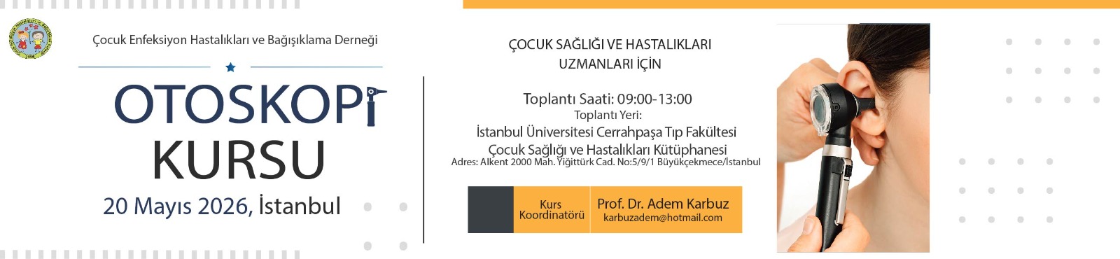 08 Nis 2026 Otoskopi Kursu - 20 Mayıs 2026 OTOSKOPİ KURSU, 20 Mayıs 2026 tarihinde İstanbul Üniversitesi Cerrahpaşa Tıp Fakültesi Çocuk Sağlığı ve Hastalıkları Kütüphanesi'nde gerçekleştirilecektir.Bilimsel program için tıklayınız. Bu gönderiyi paylaş Bir yorum yaz Ad-Soyad * E-posta adresiniz * Yorumunuz *